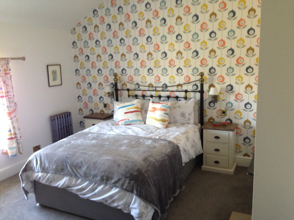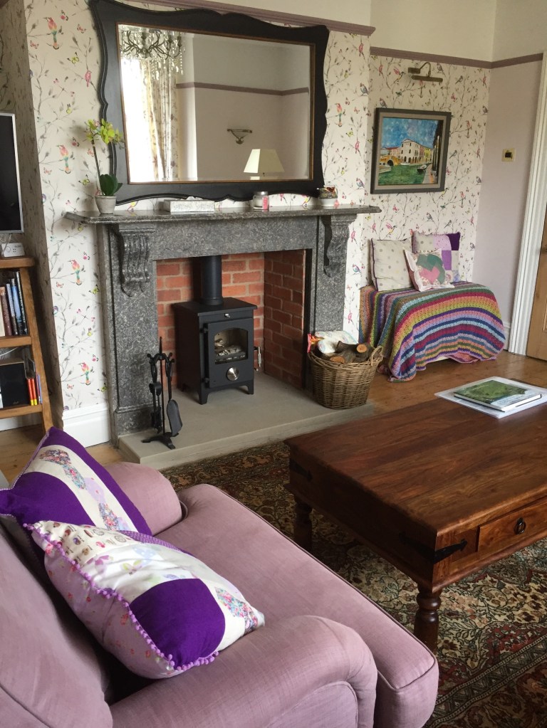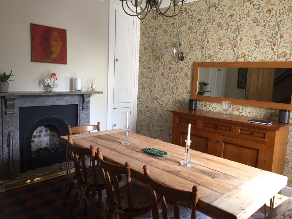 A large rustic farmhouse table comfortably seats eight in the dedicated dining room. This room is packed with Victorian charm with the original black and red floor tiles, historic fireplace and William Morris wallpaper. Eating together here is a lovely and sociable pleasure!